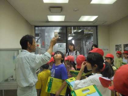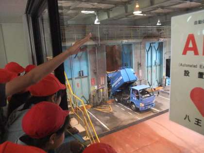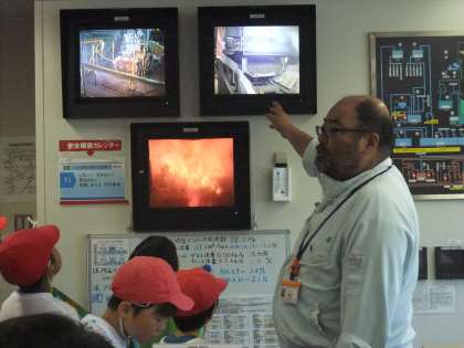 次に3つのグループに分かれてコックピットや中央制御室などの見学を行いました。ゴミを積んだ収集車がコックピットに入ってくる様子や集まったゴミを大きなクレーンでつかみ取る様子など子供たちは興味津々で見ていました。 分かったことを見学カードに熱心に書き込む姿も見られました。