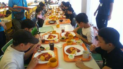 学食では、自分達で食券を買う体験もしました。日替わりランチは、オムライスです。大人用の盛り付けでしたが、子供たちはペロリと平らげていました。