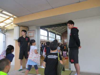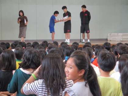 今日は、八王子のプロバスケットチームのビートレインズの皆さんが学校に来てくれました。朝のあいさつ運動にも参加していただき、全校児童とあいさつを交わしました。また、子供たちに無料のバスケット参観チケットもいただきました。