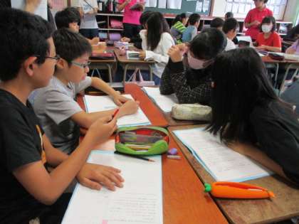 6年生の国語の授業を参観しました。宮沢賢治の「やまなし」の学習の6時間目。「やまなし」の物語の魅力について考えたことを話し合い活動を通して友達同士で共有し、ワークシートにまとめる学習に取り組んでいました。高学年では、校内研究の一環として物語文の学習を通して、主体的・対話的で深い学びの視点に立った授業づくりに取り組んでいます。6年生の子供たちは、「やまなし」の魅力について感じたことや考えたことを交流し合う場面が見られました。