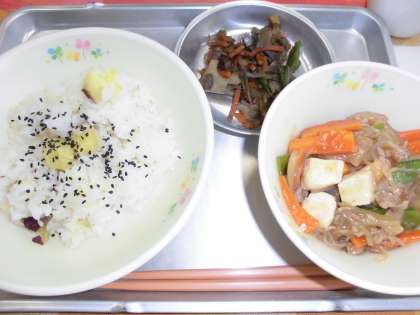 旬のさつまいもをたっぷり使った「さつまいもごはん」を作りました。さつまいもには、日本人に不足している栄養素である「食物繊維」がたっぷり入った野菜です。昔から野菜をたくさん食べていた日本人はお腹の中の腸が長くなりました。長い腸をきれいにするためには、たくさんの食物繊維が必要です。