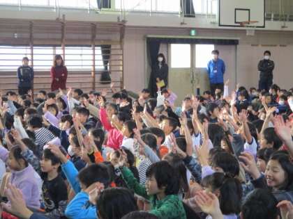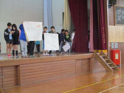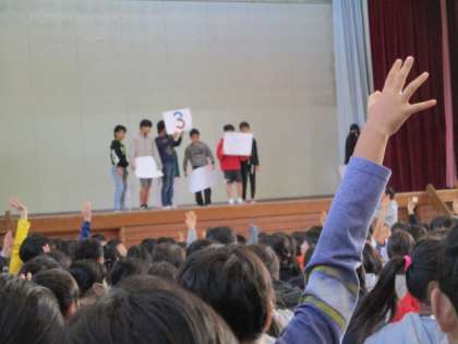 今日の集会は保健委員会からの発表集会でした。保健委員会の子供たちから「ハンカチ・ティッシュ調べ」の結果発表がありました。また、健康に過ごすために大切なことについてのクイズもありました。正解発表では大いに盛り上がり、楽しい集会となりました。