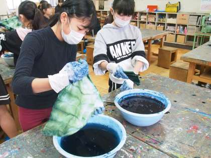 まずは、ハンカチを水につけて十分湿らせた後、染料の中へ1分間漬け込む。また、水につけます。星先生の「布の隅々まで染料がいきわたるよう、布を広げながら漬け込みましょう」というアドバイスをもらい、先生のやり方を見ながらハンカチ染めに挑戦していました。染料に漬けているだけでは、あの独特の藍色は出ないのですが、いったん空気に触れた途端、真っ青な藍の色に染まっていくのを見て、「わー!!」「きれい!!」と感嘆の声をあげていました。