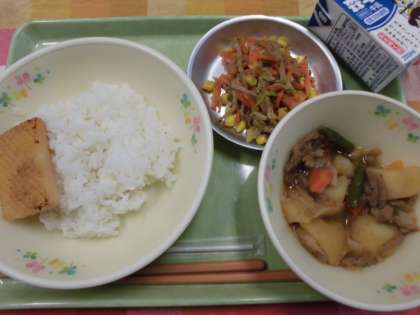 本日はいかのねぎ塩焼きを作りました。いかの大きさは、身体の成長に合わせて低・中・高学年で10グラムずつ変えています。(低学年40グラム・中学年50グラム・高学年60グラム)