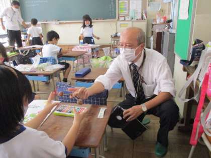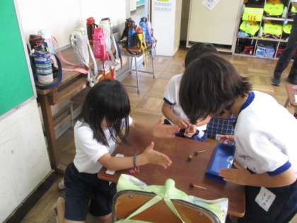 1年生の生活科の授業を参観しました。遠足に行ったときに集めてきたドングリや松ぼっくりなどの木の実を使っておもちゃ作りに取り組んでいました。
