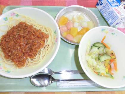 今日のメニューは運動会にちなみ、「紅白」をテーマにしたメニューにしました。パスタで白、ミートソースで赤を表現しています。子どもたちの大好きなメニューです。たくさん食べて元気に運動会を迎えてほしいと思います。