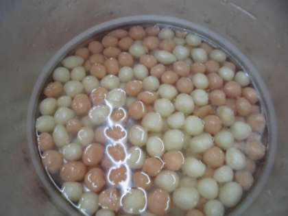 デザートは紅白白玉フルーツを作りました。白ワインとお砂糖、水で作ったシロップに、紅白白玉とフルーツミックスを混ぜました。赤い白玉はトマトジュースで色づけしてあります。
