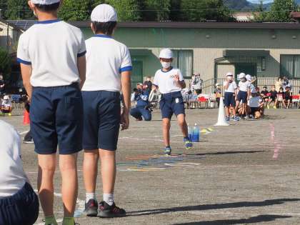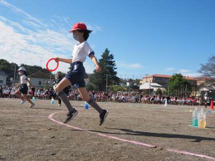 最初の競技は4年生です。種目名通り、とんだりはねたりしながら元気いっぱい走ります。いつも元気な3年生のはつらつとした動きは、見ているみんなも元気にします。精一杯走り切り、仲間にバトンをつないでいました。