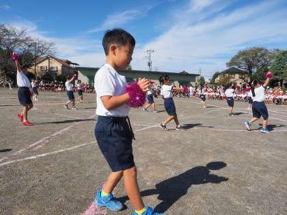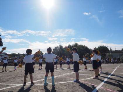 1年生の初めての運動会は、かわいいダンスを披露しました。腕にキラキラのブレスレットをまいてノリノリで踊っていました。決めのポーズもかわいらしく、会場が笑顔で包まれます。隠れていたお日様も1年生の元気パワーで顔を出してくれました。