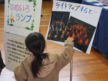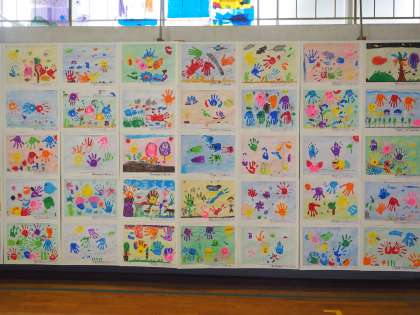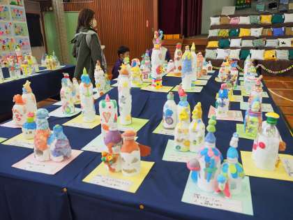 2年生「手がたでアート」(絵)「ゆめいろランプ」(立体)。手がたを生き物に見立てて楽しい絵を描きました。また、紙粘土を着色し、ペットボトルを使って素敵なランプシェードを作りました。暗いお部屋で、ぜひライトをつけて楽しんでください。