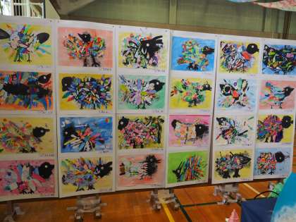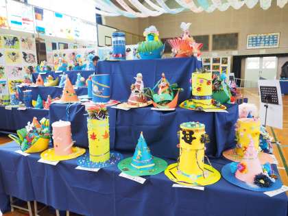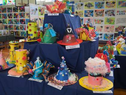 3年生は「おしゃれなカラス」(絵)と「おしゃれなぼうし」(立体)です。イソップ物語の「おしゃれなカラス」のお話の世界を表現しました。また、シルクハットや魔女の帽子、オランダ帽子の型から好きなものを選んで飾りを付けました。3年生の「おしゃれ」コーナーはとても華やかでした。
