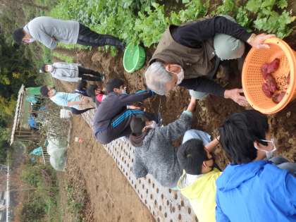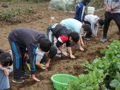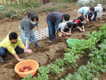 高学年児童は、田中さんの畑仕事の体験をさせていただきました。田中さんと一緒にサツマイモの収穫をさせていただきました。大きな大きなサツマイモが収穫でき、子供たちも大喜びでした。今回は収穫体験でしたが、収穫するまでに畑の手入れや水やり、そして収穫前のつるの処理など大変なお仕事があることも教えていただきました。
