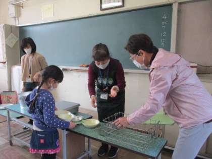 2組では栄養士の先生から給食のお話を聞いていました。これから始まる給食に向けて、実際の食器を使って配膳の仕方や戻し方などを教えてもらっていました。給食が始まるのが楽しみですね。