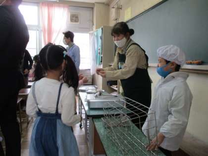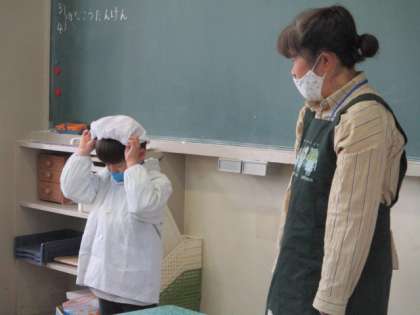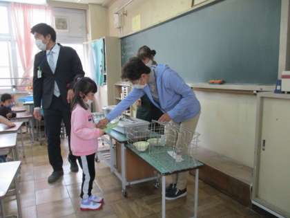 明日から始まる給食に向けて、栄養士の先生から給食についてのお話と、配膳の仕方についてご指導いただきました。給食当番さんの支度の仕方や、給食の配膳までの待ち方など、実際の食器を使いながら練習しました。取りに行くときや返却するときは教室を一方通行にして、子供たち同士が接触しないように配慮します。