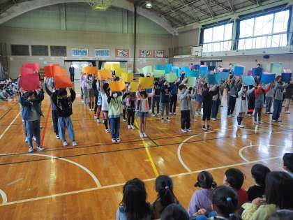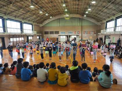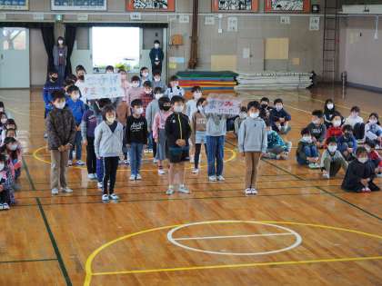 4年生は歓迎の言葉が書かれた色とりどりの画用紙を使って素敵な演出でお出迎えです。何が書かれているのか1年生も興味津々で見ていました。