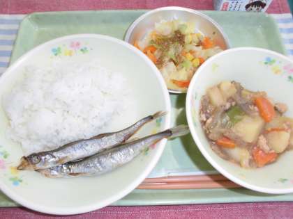 今日の献立は、ごはん・焼きししゃも・じゃがいものそぼろ煮・ボイル野菜のごまじょうゆ・牛乳です。ごまじょうゆドレッシングは、さとう・しょうゆ・米酢・塩・ごま油・白ごまを混ぜ合わせて作ります。ゆでた野菜や、焼いた魚など何にでもあいます。お試しください。