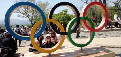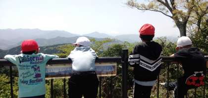 頂上からうっすら富士山も見えます。オリンピックのモニュメントもあります。高尾山の自然を堪能しています。