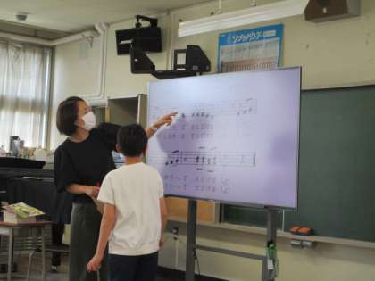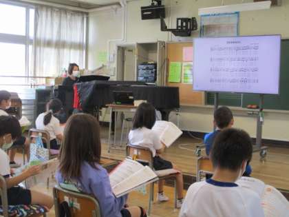 4年生の音楽の授業を参観しました。大型テレビのモニターを使ってリズム打ちや音階当てクイズなど楽しく学習していました。歌唱「花束をあなたに」は、曲の盛り上がる部分の歌い方や二部に分かれて歌う部分などを確かめながら歌いました。工夫しながら進めています。