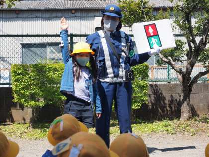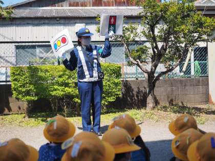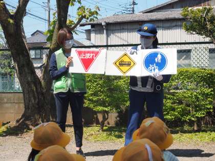最初に中庭で、交通安全のための交通標識について教えてもらいました。また、信号機の絵を見ながら安全な横断歩道の渡り方についても教えていただきました。子供たちも真剣に聞いています。
