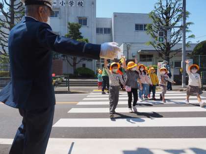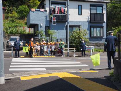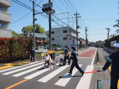いよいよ学校の前の横断歩道の渡り方を練習します。たくさんのおまわりさんやサポーターの皆さんに見守っていただきながら、安全に気を付けて横断歩道を渡ることができました。
