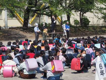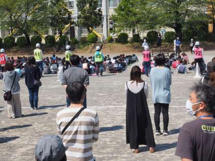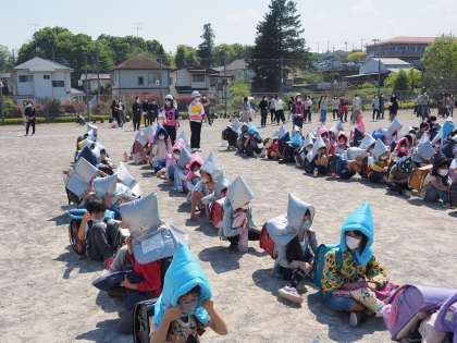 集合した後は、今日の訓練の目的と、どのような行動をすればよいかについて話を聞きます。真剣に訓練に臨む態度に感心しました。その間にも、引き渡しに来てくださったお家の方が、続々と校庭に集まってきました。その様子から、子供たちもこの訓練の大切さを実感したようです。