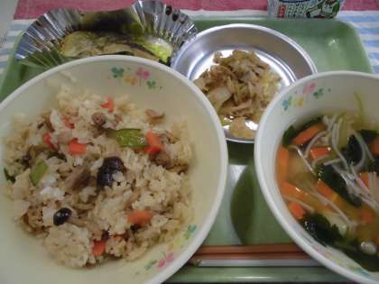 今日の献立は、かてめし・白身魚の桑都焼き・絹のお吸い物・梅おかかキャベツ・牛乳です。今日は、桑都御膳です。八王子市は、「桑の都」と呼ばれ、養蚕業、絹織物産業が盛んでした。今日は、桑の葉粉をマヨネーズに混ぜ、白身魚の上にかけてオーブンで焼きました。また、シルクパウダーを混ぜ込んだ白玉だんごとそうめんを入れたお吸い物を作りました。