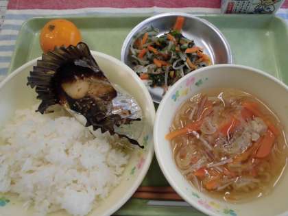 今日の献立は、ごはん・さわらのみそマヨネーズ焼き・3色ナムル・くずきりすまし汁・冷凍みかん・牛乳です。さわらは、出世魚ですが、今日は本さわらではなく、もう少し小さいサイズのさごしを使いました。塩・みそ・マヨネーズ・砂糖・みりん・白ごまを混ぜたものをかけて、オーブンで焼きました。
