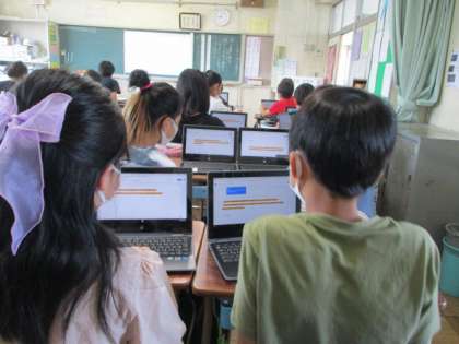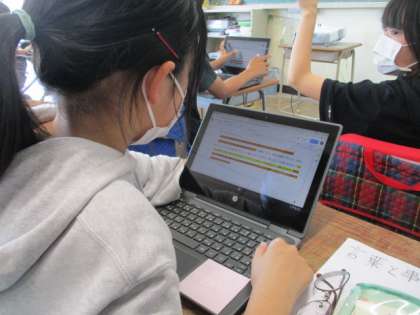 校内研究の取組として、5年生の国語の授業を参観しました。「言葉と事実」の4〜8段落目から、筆者が伝えたいことを捉え、短い言葉でまとめる学習活動に取り組みました。さらに、みんなが引いたアンダーラインの部分の中で、大切な部分を絞り込み、学習用端末を使って文章を削っていきます。選んだ人数が多かった部分にはオレンジのラインで引き、何人かの意見から選ばれた箇所は黄色のマーカーで引き、最終的に残った本文から、さらに、筆者が一番伝えたかったことについて、文章を削ったり書き加えたり接続詞を入れたりしながら、できるだけ短い言葉で要約文を作っていきます。最後にみんなの考えを共有する際も、各自の考えをモニターに映し出し共有しました。こうして、思考ツールとしても学習用端末を活用しています。