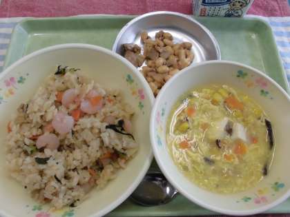 今日の献立は、えびチャーハン・鶏肉と大豆の炒め物・中華風たまごとコーンのスープ・牛乳です。えびチャーハンは、しょうが・長ねぎを炒め、玉ねぎ・にんじん・ポークハムを炒め、むきえび・小松菜を加え、塩・こしょう・しょうゆ・ごま油で味付けし、酒としょうゆを入れて炊いたごはんと混ぜました。スープは、削り節でとっただし汁で玉ねぎ・にんじん・きくらげを煮てホールコーン・クリームコーン・豆腐を加え、塩・こしょう・ごま油で味付けし、でんぷんでとろみを付け、卵を散らしました。今日の地場野菜は、長ねぎと小松菜です。