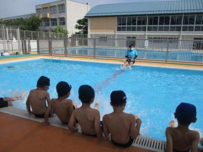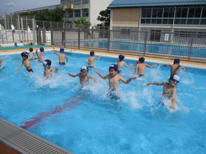 いよいよ今年度の水泳指導が始まりました。プール開き初日からいい天気。絶好のプール日和となりました。1・2時間目は1年生の1学級が入りました。学校での初めての水泳指導です。小プールを使って楽しく活動しました。