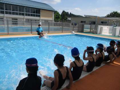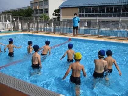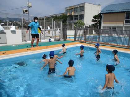 1年生は、まずは水慣れから始めます。プールの入り方もしっかりと教室で勉強してきたので、先生の笛の合図で入ることができました。水の中でいろいろな動作をしながら、水への抵抗感をなくしていきます。先生の動作のまねっこも楽しくできました。