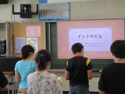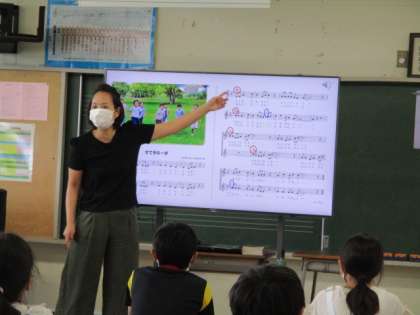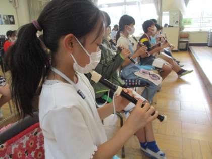 5年生の音楽の授業を参観しました。最初はイントロクイズからスタートです。ピアノの前奏を聞いて何の歌かわかったら、立ち上がって歌います。メロディーが聞こえると、すっと立ち上がって歌いだす姿があり、楽しんで活動していました。学習する歌唱曲の楽譜がモニターに映し出され、強弱記号を確かめながら歌唱にも取り組んでいました。リコーダー奏も、サミングの息の入れ方や指使いの確認をした後、列ごとに練習をしていきます。コロナ禍でなかなか思うように学習できなかった音楽ですが、感染症防止に配慮しながら練習に取り組んでいます。
