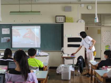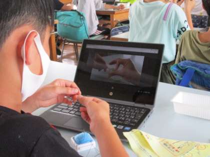 5年生の家庭科の授業を参観しました。裁縫の単元で、今日は「玉結び」「玉止め」を学習しました。やり方をみんなで確認した後、練習用の布を使ってやってみます。「玉結び」や「玉止め」のやり方は、各自、学習用端末の動画でも確認できます。動画を何度も再生しながら練習する姿がありました。