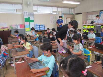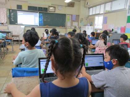1年生の算数の授業を参観しました。たし算のまとめの学習として、ミライシードの足し算の計算問題に取り組んでいました。