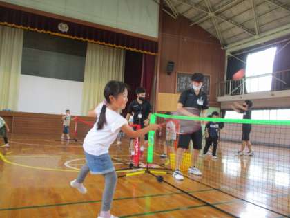 後半はいよいよミニラケットを使ってボールを打つ練習をしました。最初はなかなか当たらなかった子も、何度も練習をするうちに、上手にボールを打ち返せるようになりました。メガロスのコーチの皆さんから、