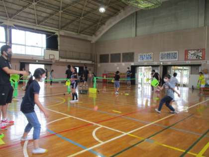 さすが、高学年グループです。手のラケットを使ったボールのやり取りも上手です。コーチたちから、もっと難しい技を教えてもらうと、果敢に挑戦する姿がありました。