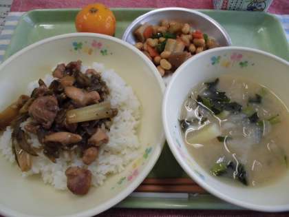 今日の献立は、焼きとり丼・五目煮豆・小松菜のみそ汁・冷凍みかん・牛乳です。おはし名人ウィーク4日目は、「つまむ」です。五目煮豆をつまむのは、大人でも難しいですが、しっかりと練習しましょう。