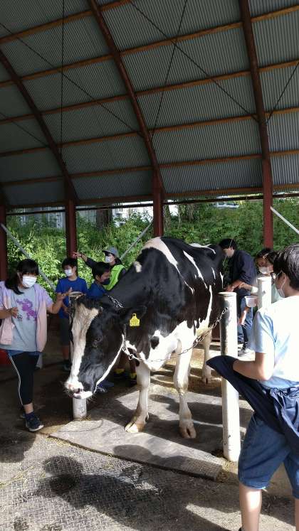 乳絞り体験が始まりました。「アイリスちゃんかわいい」と言いながら触れてもいます。