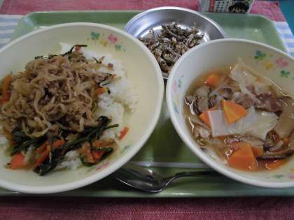 今日の献立は、ビビンバ・ワンタンスープ・ごまめナッツ・牛乳です。ビビンバは、にんじん・ほうれん草・もやしのナムルと、にんにく・しょうが・豚のひき肉・切り干し大根を炒め、甘辛く味付けした肉大根を、炊きたてごはんにのせて混ぜて食べます。