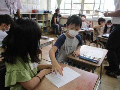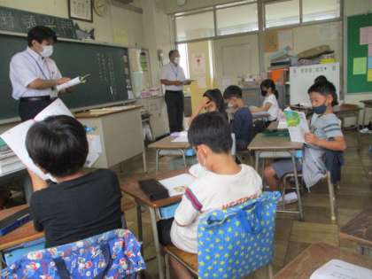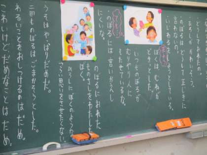 2年生の道徳の授業を参観しました。「おれたものさし」の教材文を使って、「良いと思うことを進んで行う心情を育てる」ことをねらいにした授業が行われました。教材文を読んで、友だちがよくないことをしているのを見た時の主人公の気持ちを考えます。