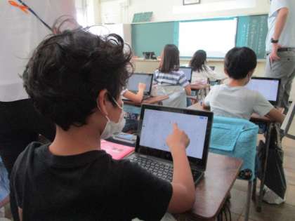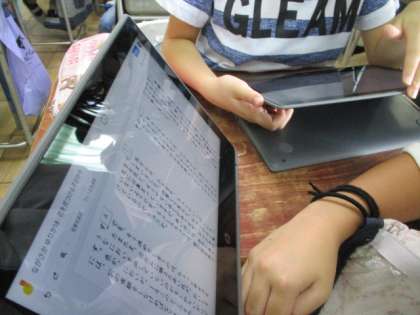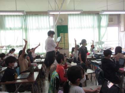 校内研究の取組の一環として、4年生の国語の授業を参観しました。「花を見つける手がかり」の第3時間目は、実験1の意味段落の学習です。4つの形式段落をつなぐ手がかりとなるキーワードを見つけて段落の並び替えをします。「チョウの動き」に着目して段落をつなげたり、「つなぎ言葉」を見つけて、最初と最後の段落を見つけたりしながら並び替え、自分の考えを伝え合います。子供たちはタブレットを操作しながら自分の考えをまとめていました。