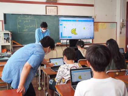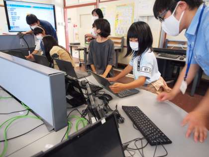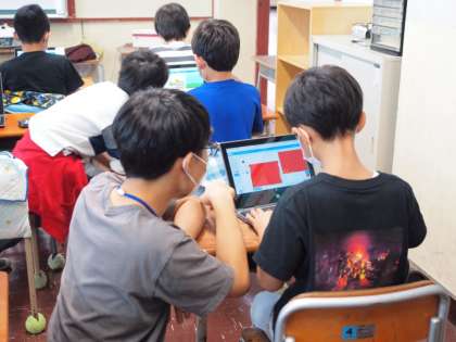プログラミングの基礎を額sっ有した後は、いよいよscratchを使った作品作りに挑戦しました。難しい用語もあり戸惑う場面もありましたが、たくさんの学生さんたちが支援してくれて、一人一人に丁寧に教えてくださいました。「フルーツキャッチ」では、フルーツを自分の好きなマークに変えたり、背景を工夫したりとオリジナルの作品作りを楽しんでいました。できた作品でを見合って楽しく遊ぶ姿もありました。子供たちは楽しみながらプログラミングを学んでいました。