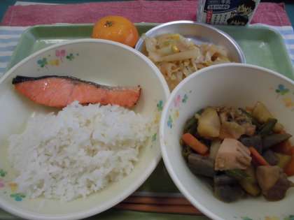 今日の献立は、ごはん・鮭の塩焼き・いりどり・和風サラダ・冷凍みかん・牛乳です。今日のサラダは、和風に合わせ、大根・れんこんが入り、ごま油を使ったドレッシングにしました。