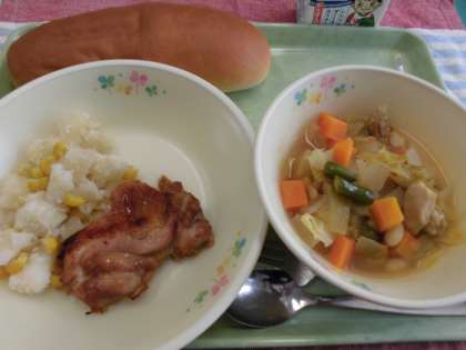 今日の献立は、ミルクパン・照り焼きチキン・野菜と豆のカレースープ煮・コーンポテト・牛乳です。今日のスープ煮は、白インゲン豆と野菜がたくさん入ってボリュームも栄養も満点です食べやすいようにカレー味にしました。
