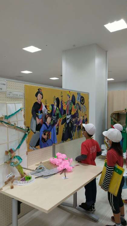 横一小6年生製作のパネルを見つけた子どもたちが、見とれていました。