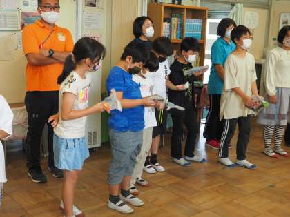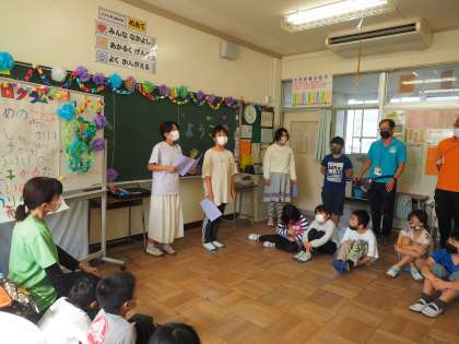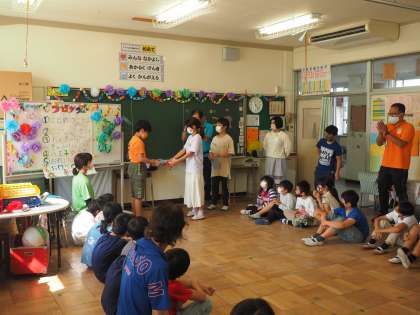 楽しい時間はあっという間に過ぎていきます。終わりの会では、プレゼントの交換もしました。手作りのプレゼントをもらって嬉しそうにしていました。そして最後は玄関でお見送りをしました。