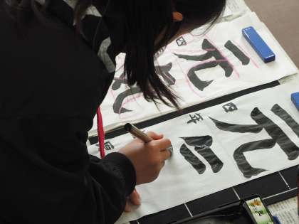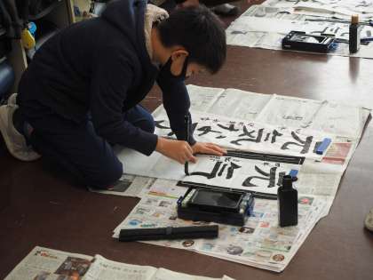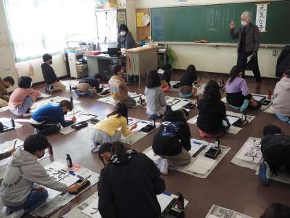 宮崎先生にはあらかじめ子供たちの冬休みの作品を見ていただき、。一枚一枚直していただきました。子供たちはそれを見ながらバランスに気を付けながら書いていきました。払うところ、止めるところを確認し、「すー、とん」と言葉にしながら文字の特徴を体と言葉で覚えていきます。子供たち心を込めて丁寧に一文字ずつ書いていきます。先生から、「上手ですよ。」「この止め方が、ちゃんとできていていいですね。」とたくさんほめていただきました。4年生の代表の児童が今年も「おおるり展」に習字を出品します。それに向けて子供たちは一生懸命練習しています。