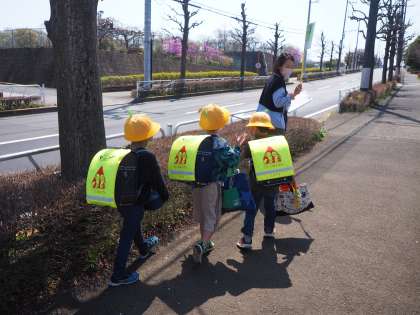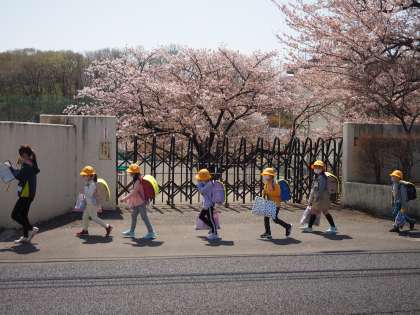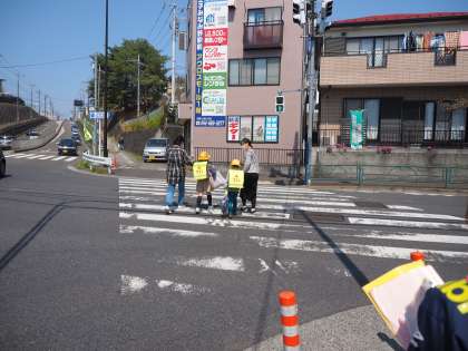 1年生のコース別の下校指導が続いています。先生の後について、通学路の安全な歩き方や下校する際の注意事項などを確認しながら歩いて帰ります。横断歩道では、「右、左、右」と安全を確認し、手を挙げて渡っています。下校コースや交通ルールをしっかり覚えて安全に登下校できるように頑張りましょう。