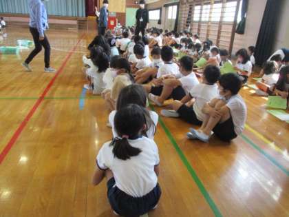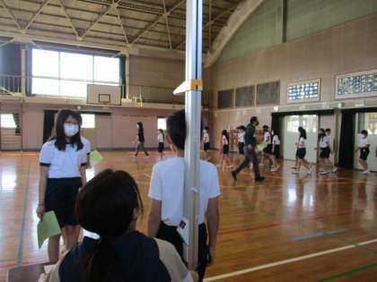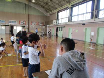 今日は一斉計測がありました。学級ごとに体育館で実施しました。密にならないように、並ぶ時も間隔を開けたりするなど工夫しながら行いました。話し声が一つも聞こえないほど静かに計測が行われていました。さすが上級生!!という態度で、低学年のお手本になっていたのも立派でした。