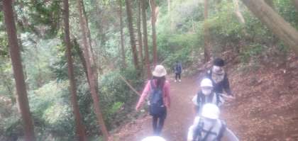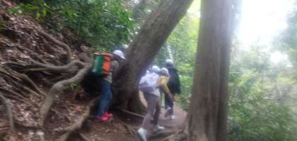 長くて細い山道を、グループで協力しながら歩きます。「滑るから気を付けてね」自然と声を掛け合う姿がありました。